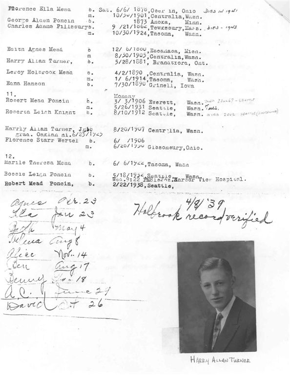 is connected to Homer L. Mead's family through Homer's daughter, Florence (Mead) Poncin. He writes, "I don't know a great deal about the Mead line other than from the point of Robert Mead Poncin, Florence's son, marrying my fathers's sister Roberta Knight and their children. I'm in contact with one of their grand-children so I can always ask her if she knows the answer to any question."