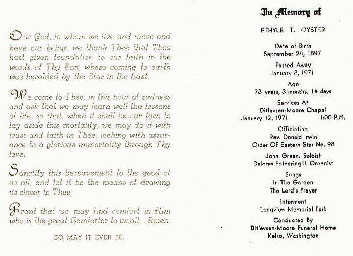 Linda Henson (Mullins) submitted the following funeral card for Ethyle (Taylor) Oyster. She notes, "Her birth and death were in Cowlitz County WA."