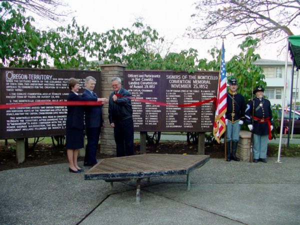 The ribbon-cutting ceremony in front of the Monticello Convention monument. From left to right are: Sarah Koss, Sam Reed and Mark McCrady.
