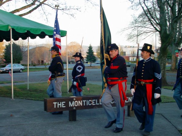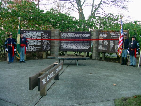 The Color Guard poses in front of the three markers that comprise the Monticello Convention monument before the ribbon-cutting ceremony. The right panel of the monument lists all the signers of the Convention - view an enlargement of this panel.