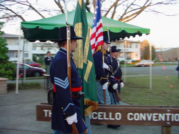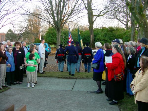 The Color Guard marches away after the commemoration in the park. The crowd consists of descendants of pioneers who signed the Monticello Convention and other interested persons. Notice the generations of people represented in the group!