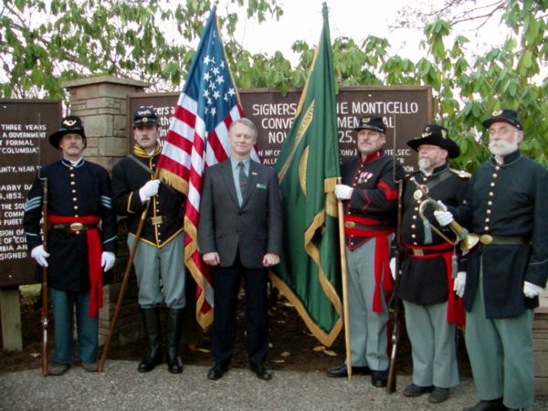 Washington Secretary of State Sam Reeds poses with members of the Color Guard in front of the Monticello Convention marker.