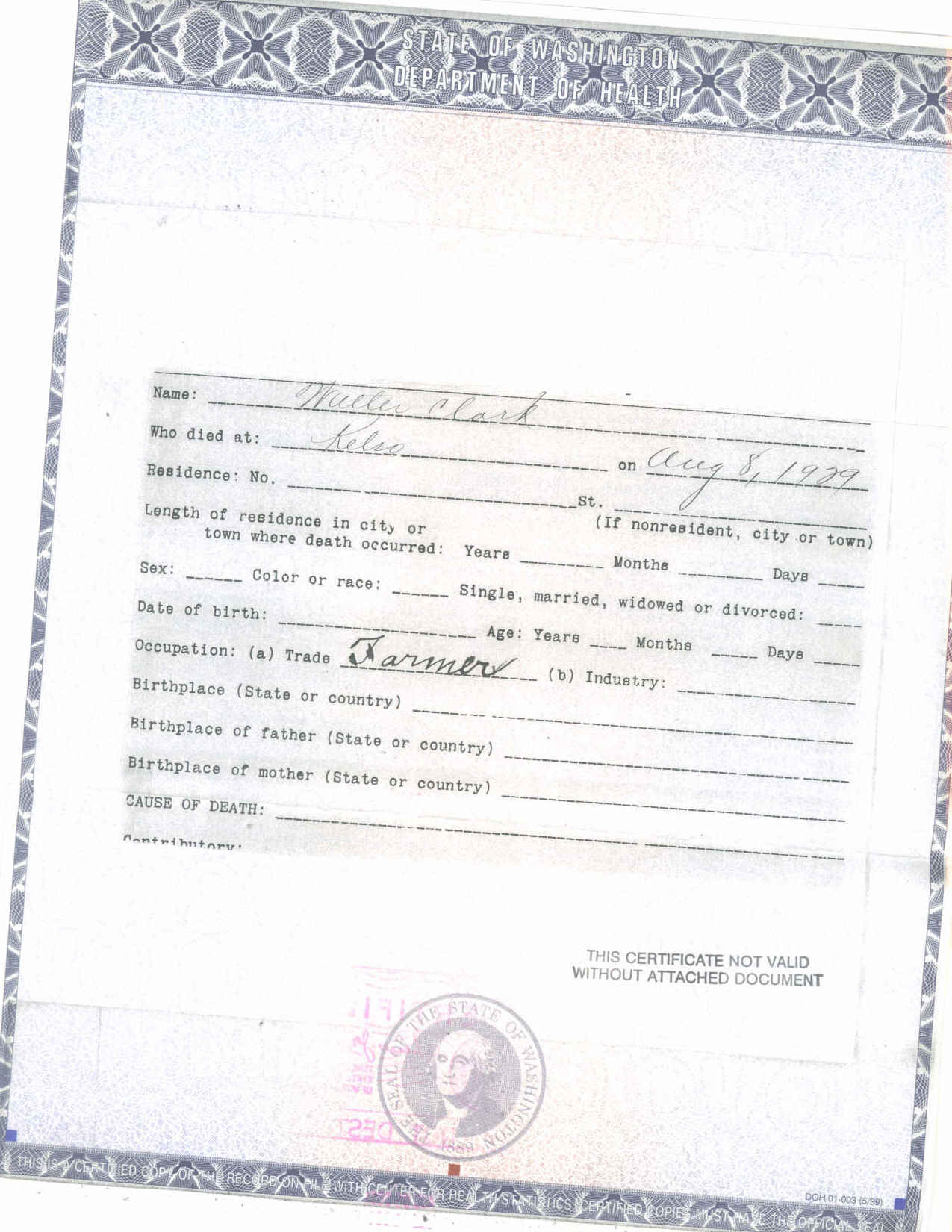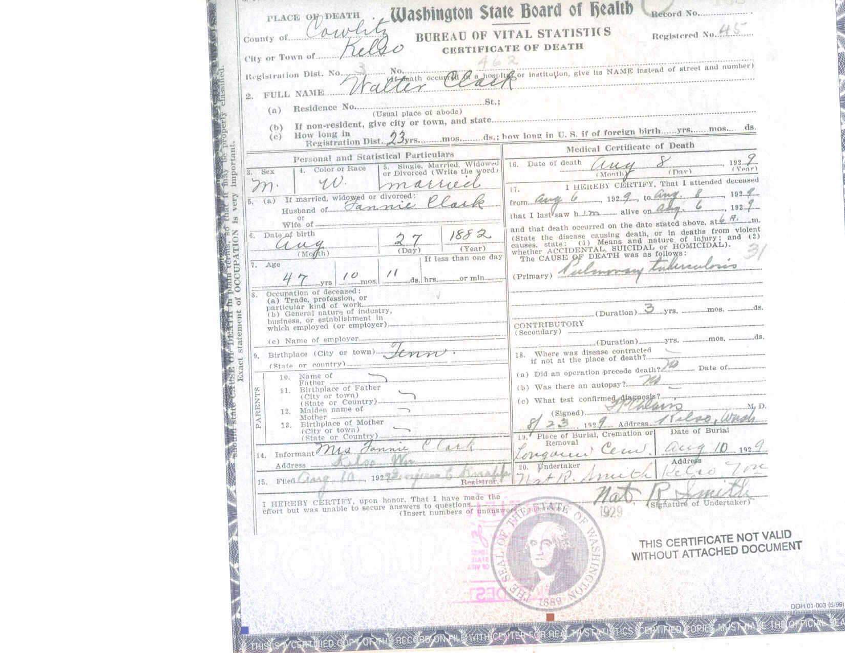 d. 8 Aug 1929 Kelso, Cowlitz, Washington (Death Certificate: Page 1, Page 2)
