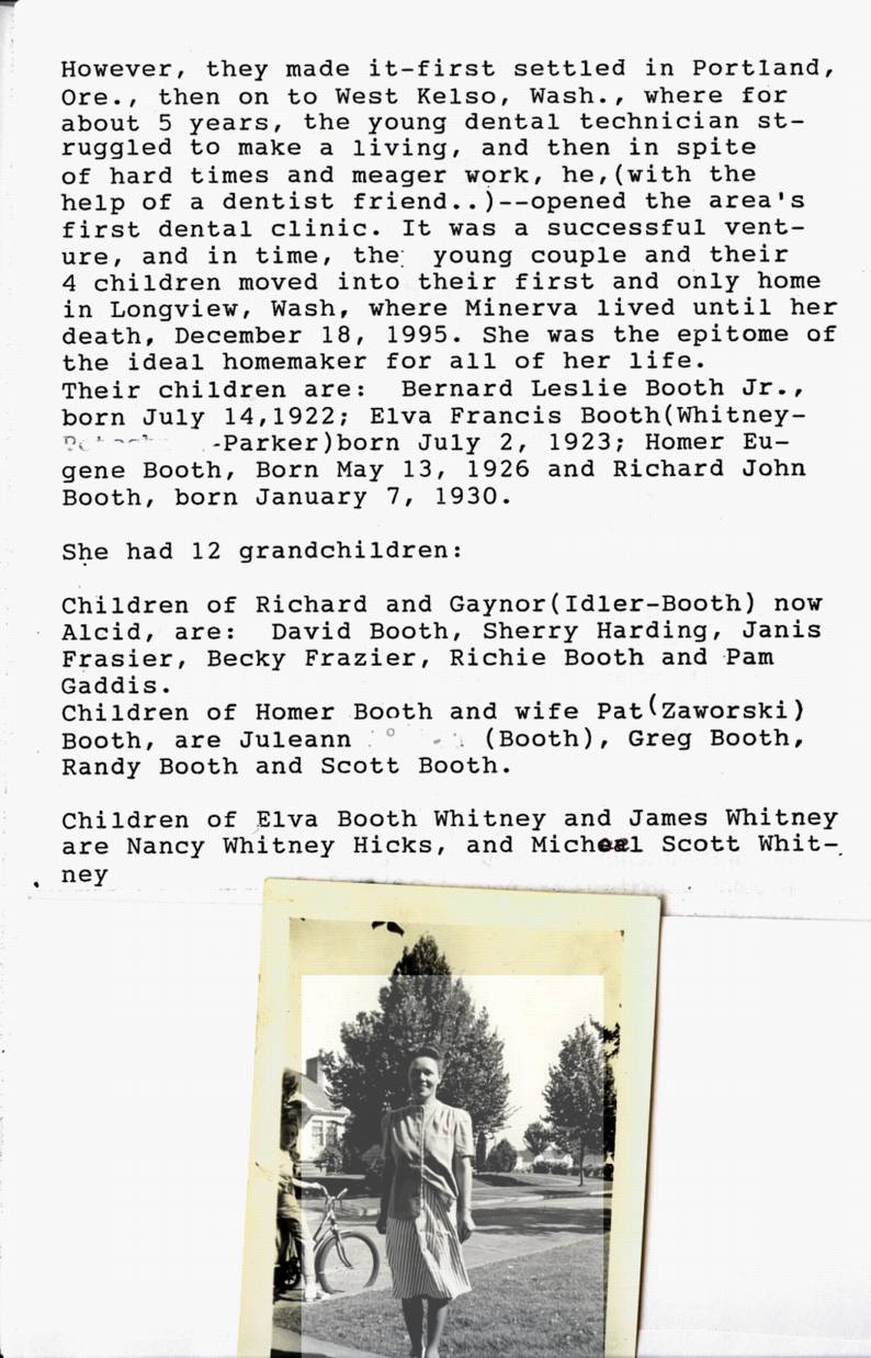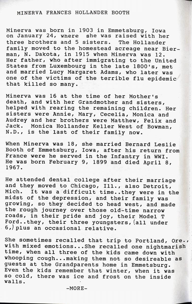 Nancy Hicks submitted the following biography of her maternal grandmother, Minerva Frances Hollander Booth, wife of B. L. Booth, of Longview, WA.