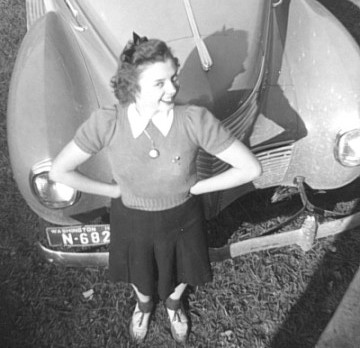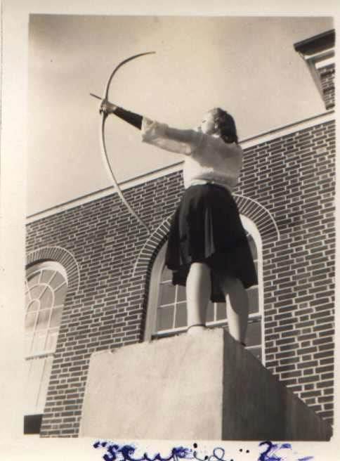 - Janet Miller posing with a bow and arrow at R. A. Long High School (1941)