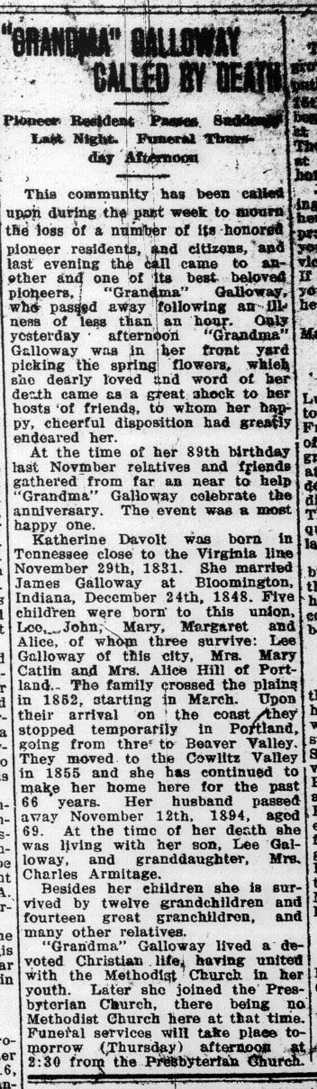Jack Hillman submitted the following obituary for Katherine (Davolt) Galloway, who was the wife of James Armstrong Galloway. The obituary appeared on March 9, 1921 in the "Kelsonian".