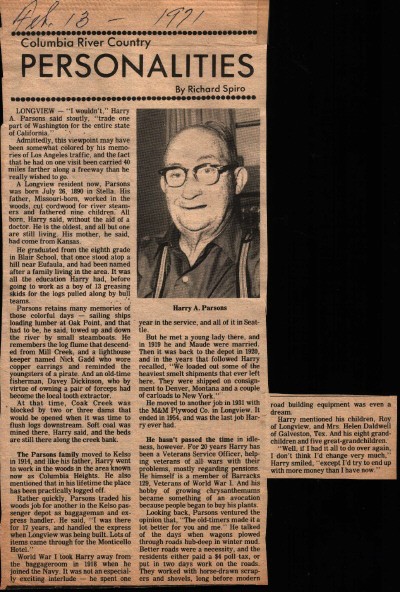 The newspaper clipping below was submitted by Rita K. Cobb Balch. Harry Parsons was the uncle of Rita's grandfather, Lennie Parsons. Additional information on Rita's PARSONS family can be found on the Parsons Photos and Childhood Memories pages.