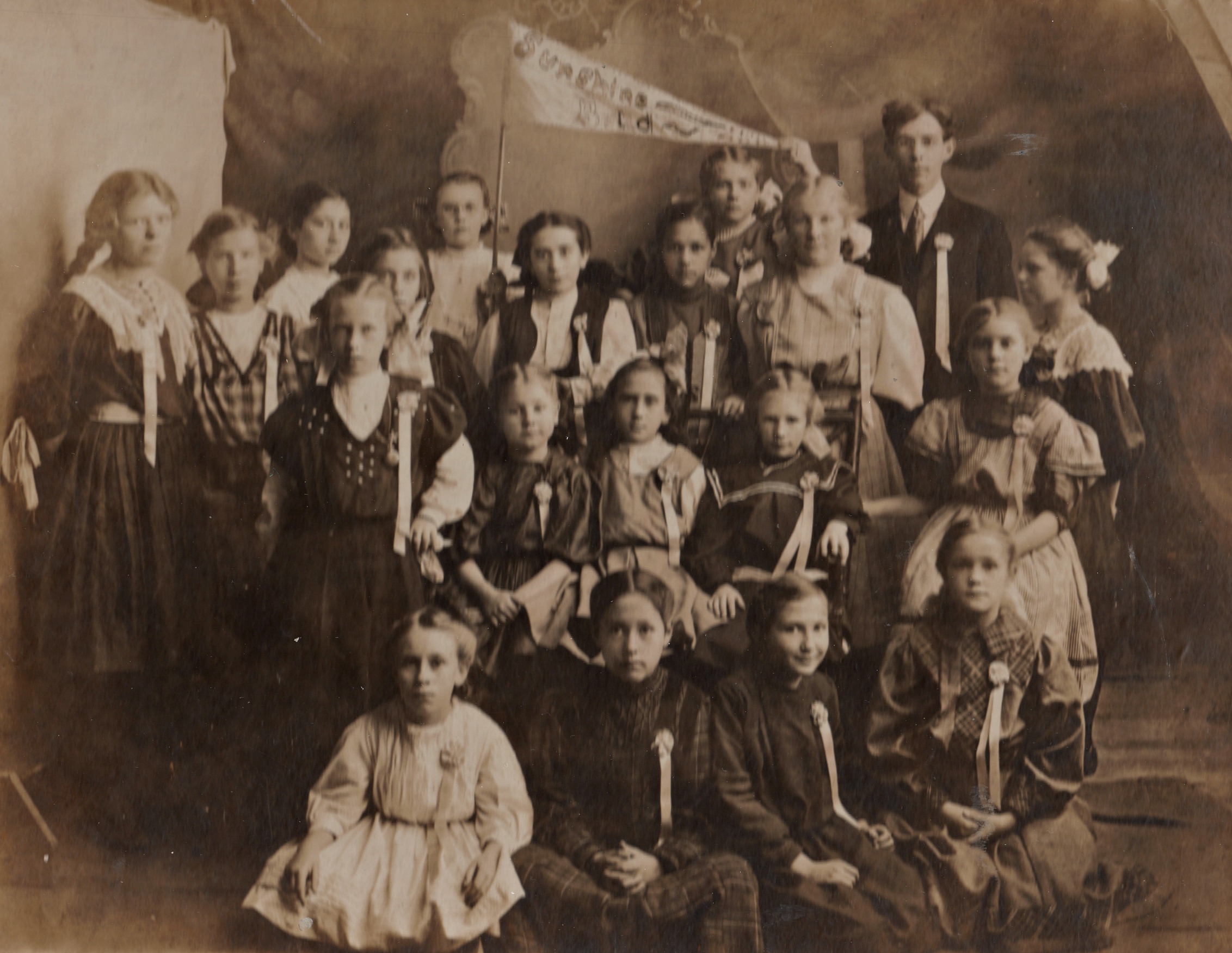 Jan Redelsperger shared the following photo of of the Sunshine Band Sunday School class from 1906, taken at the Christian Church - Kelso. Jan's aunt Byrdee Poland is in the back row holding the Sunshine Banner. She is wearing glasses and a gingham bow in her hair.
