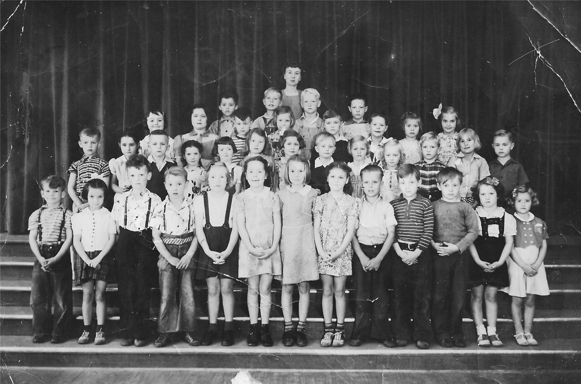 This photo was taken at Wallace School in Kelso, abt. 1940. June writes, "I'm 4th from the left in the second row. I had Miss Graham for both 1st and 2nd grade but believe this is my 2nd grade class. I have several 1st names in my memory so it will be interesting if anyone else remembers anyone. I believe Donald Courser is the 1st little boy in the same line as I'm in."