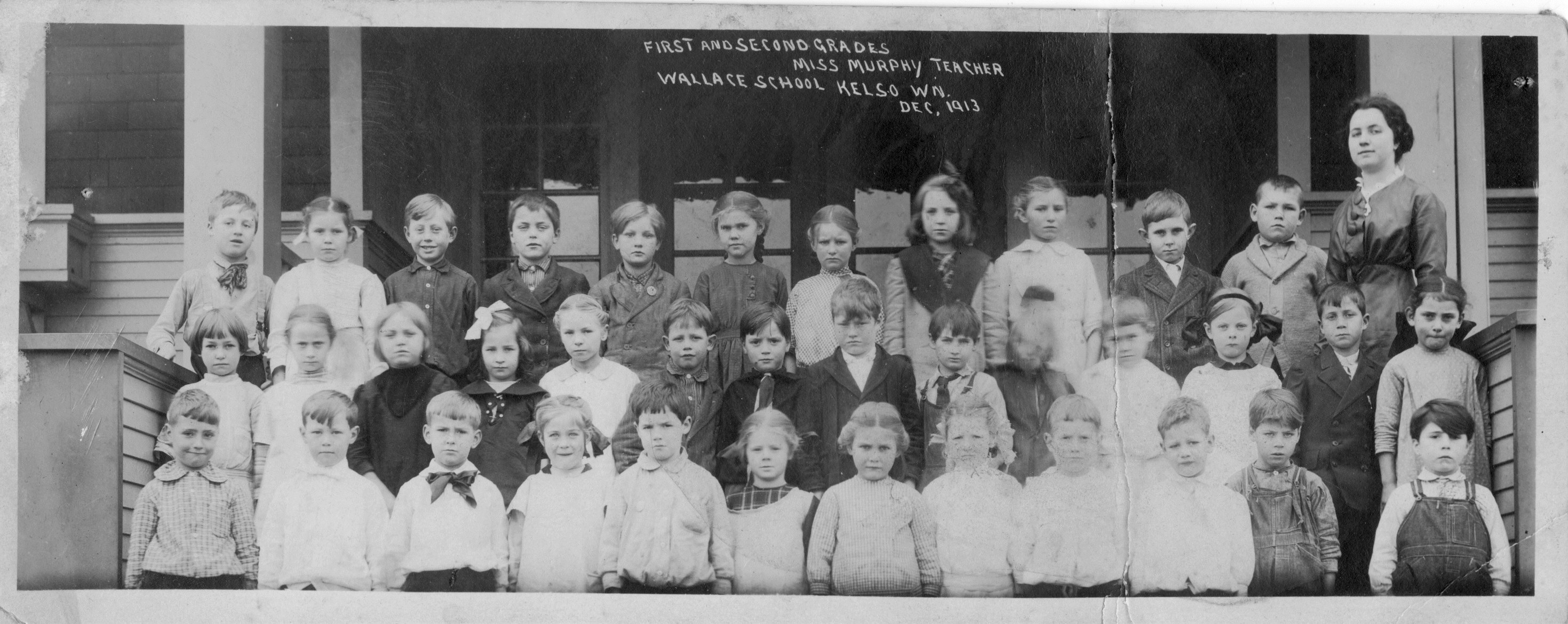 The following photo was contributed by Julie Robinson. The photo shows first and second grade students in Miss Murphy's class at Wallace School, Kelso, taken in December 1913. Julie's uncle, Robert "Zig" Price is in the top row, 3rd from the left. Her aunt, Marie Price, is in the middle row, 2nd from left. "I think Zig would have been in the 2nd grade and Marie would have been in the first grade, but that is just conjecture because they didn't just pass kids on regardless back then! I hope others can identify some of the other children."