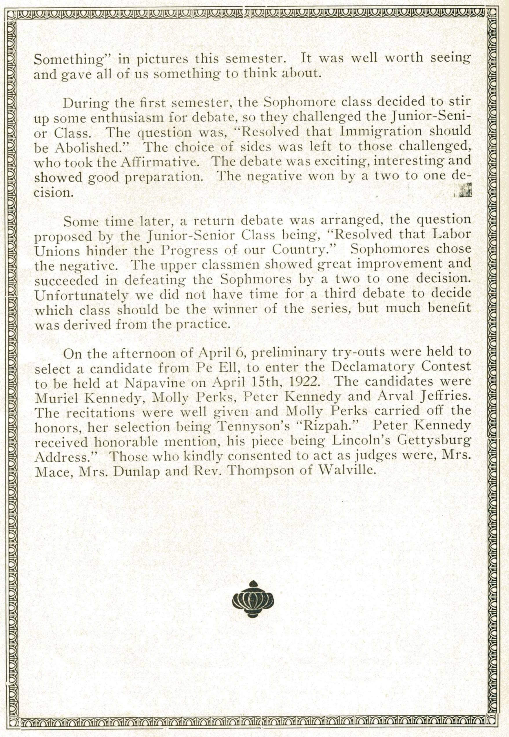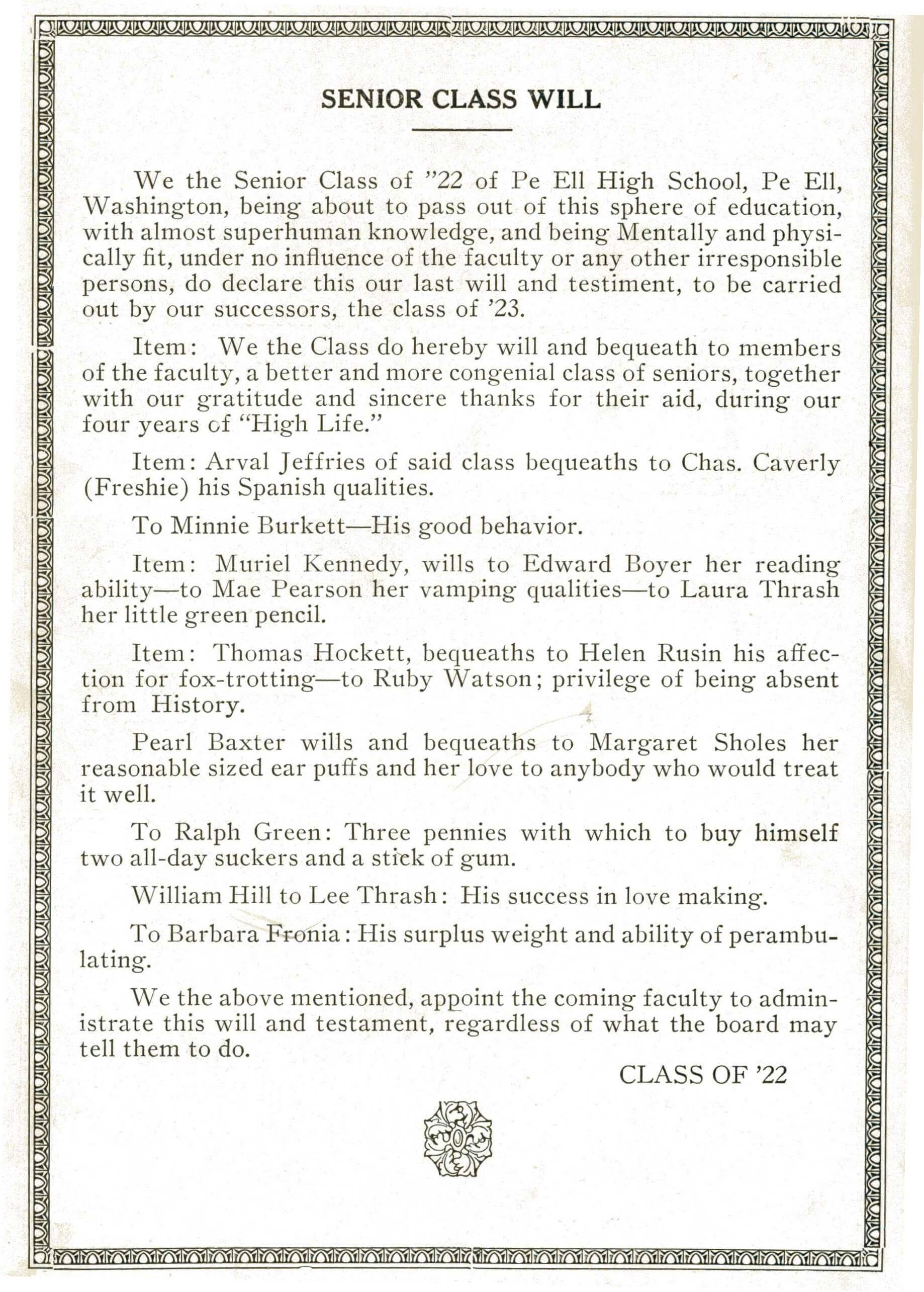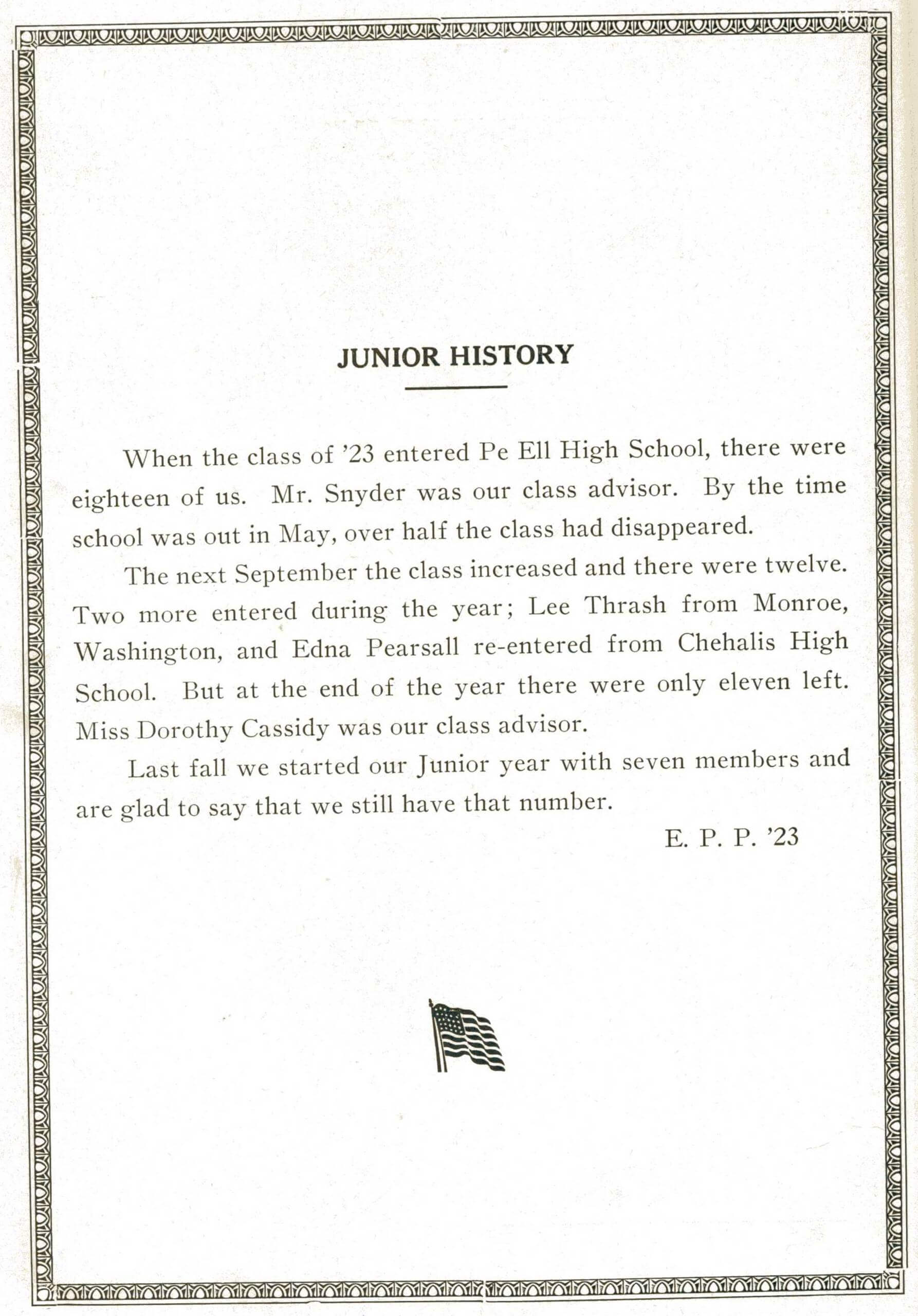 Heather has scanned and submitted the entire 1922 yearbook for Pe Ell High School. Each page is linked below. A transcription is forthcoming.