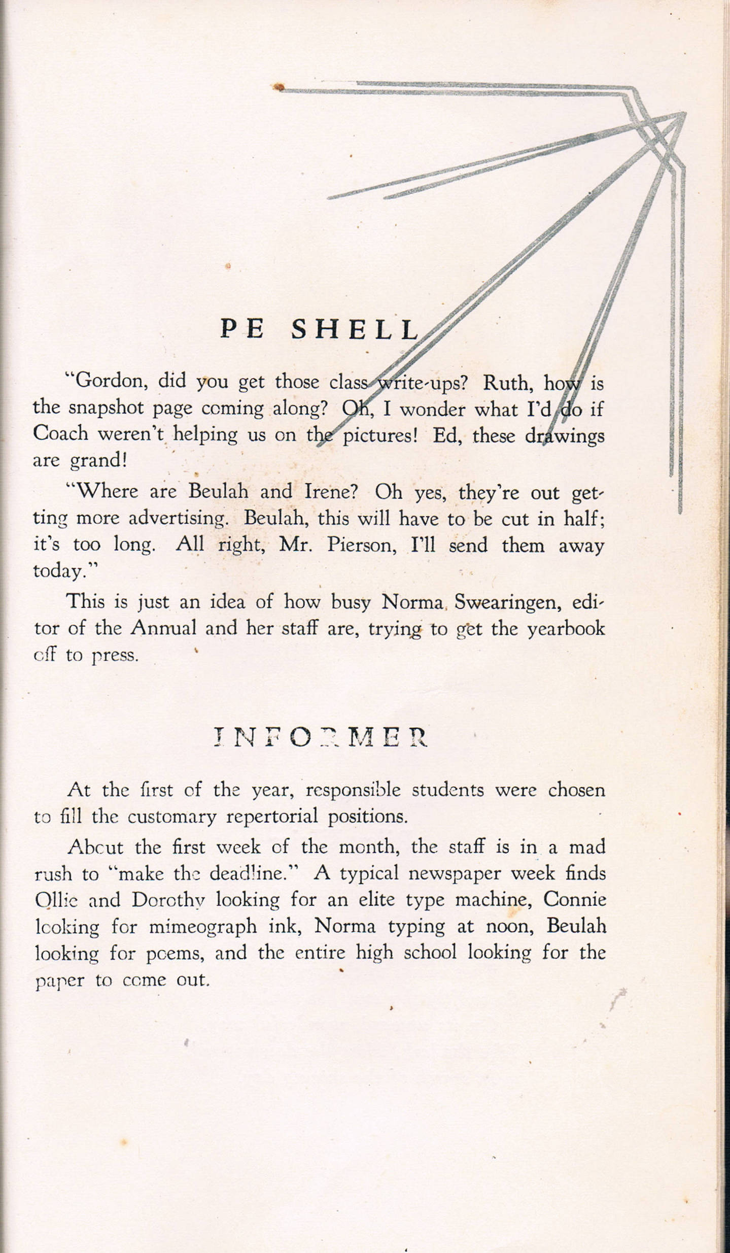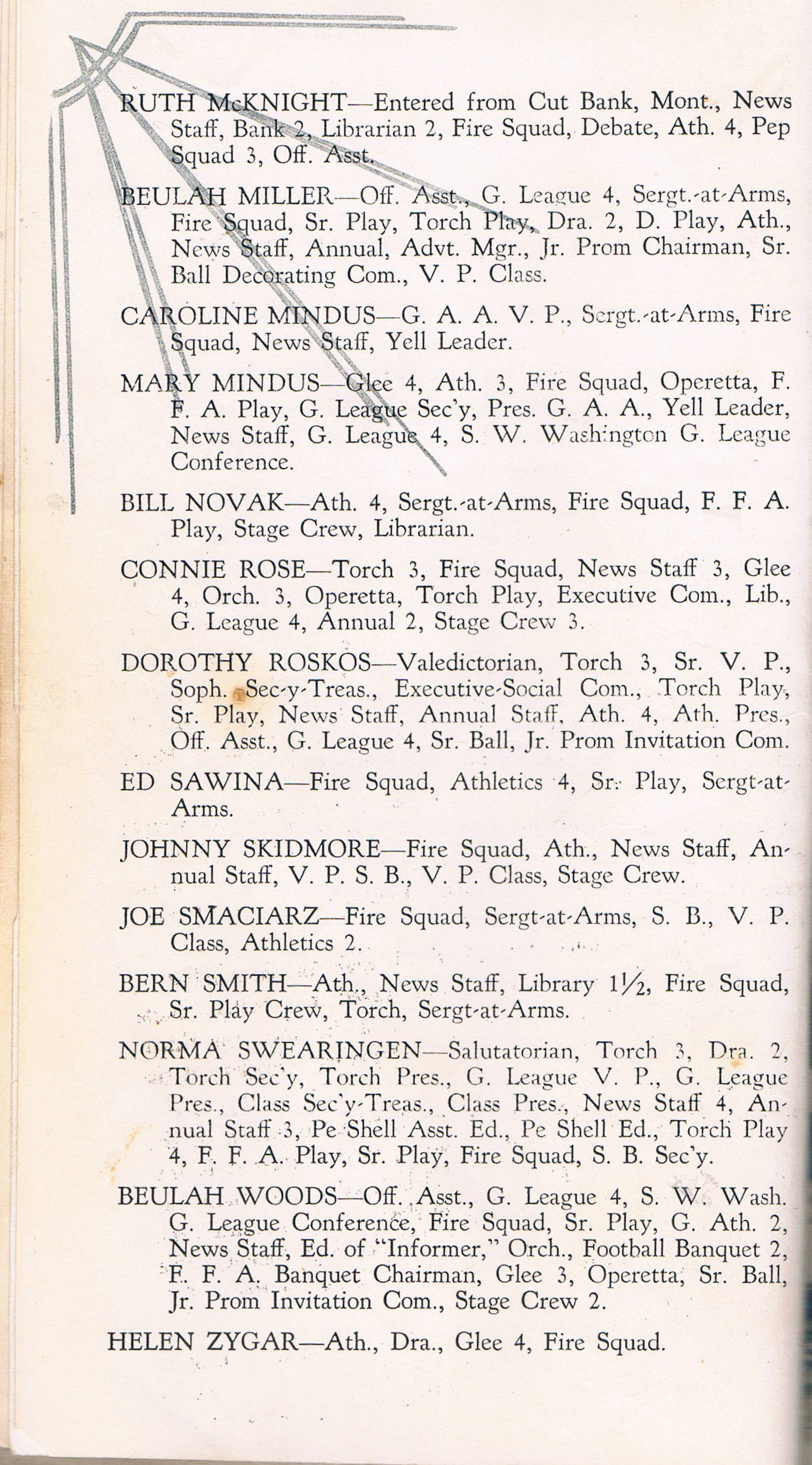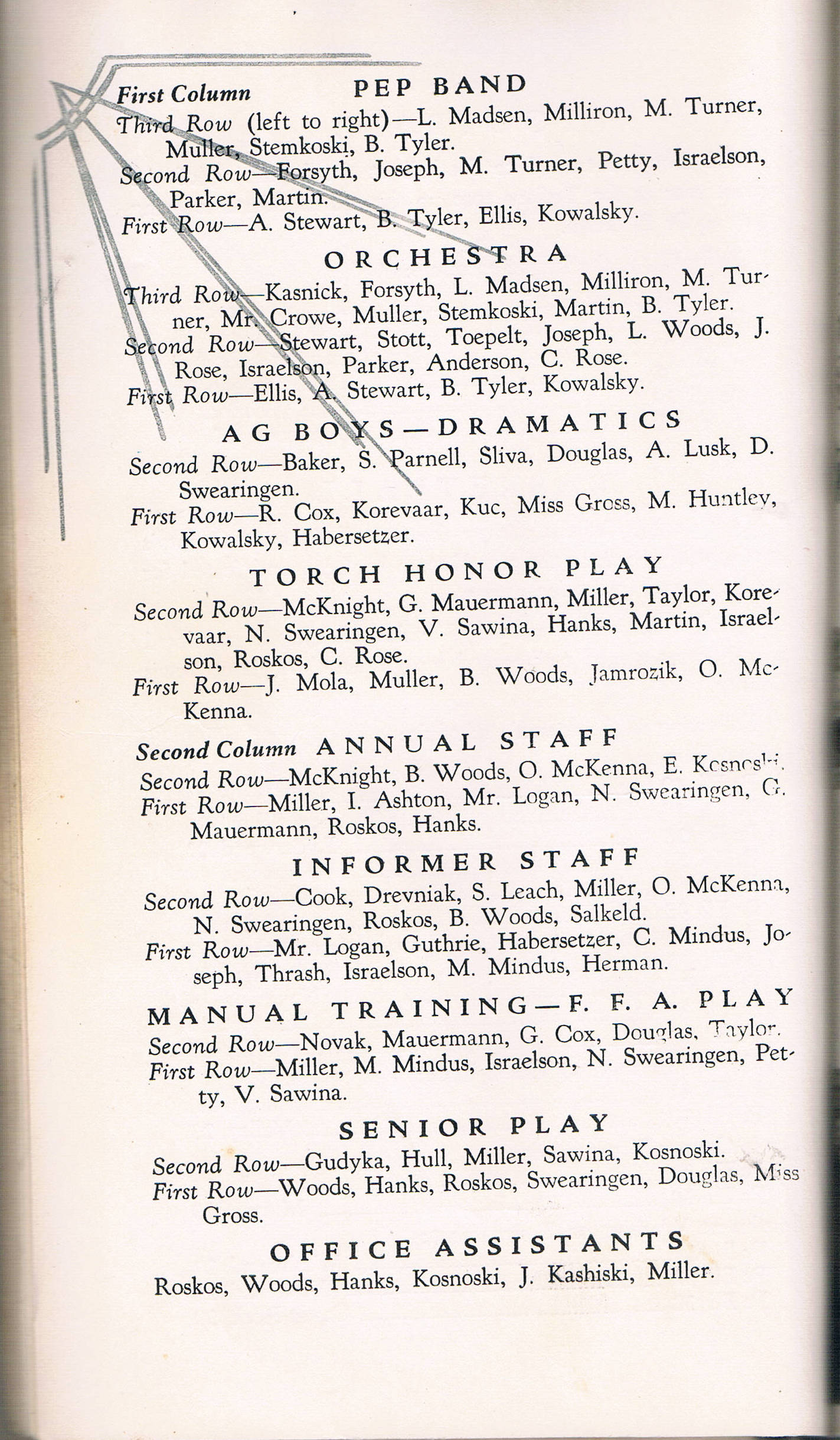 - Pep Band - Orchestra - AG Boys - Dramatics - Torch Honor Play - Annual Staff - Informer Staff - Manual Training - F.F.A. Play - Senior Play - Office Assistants
