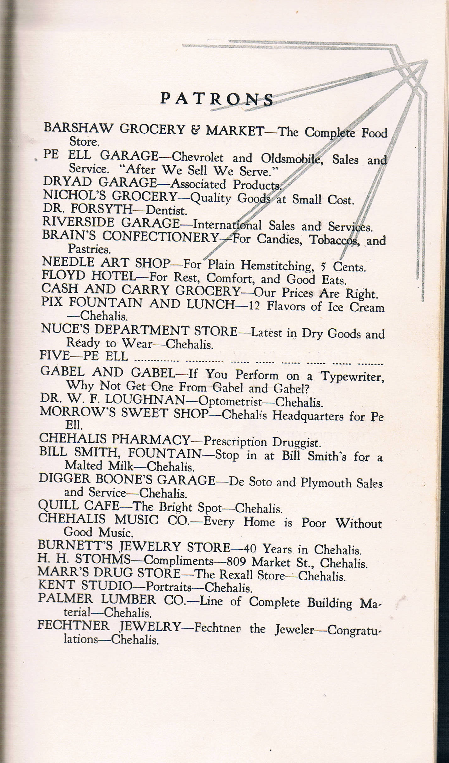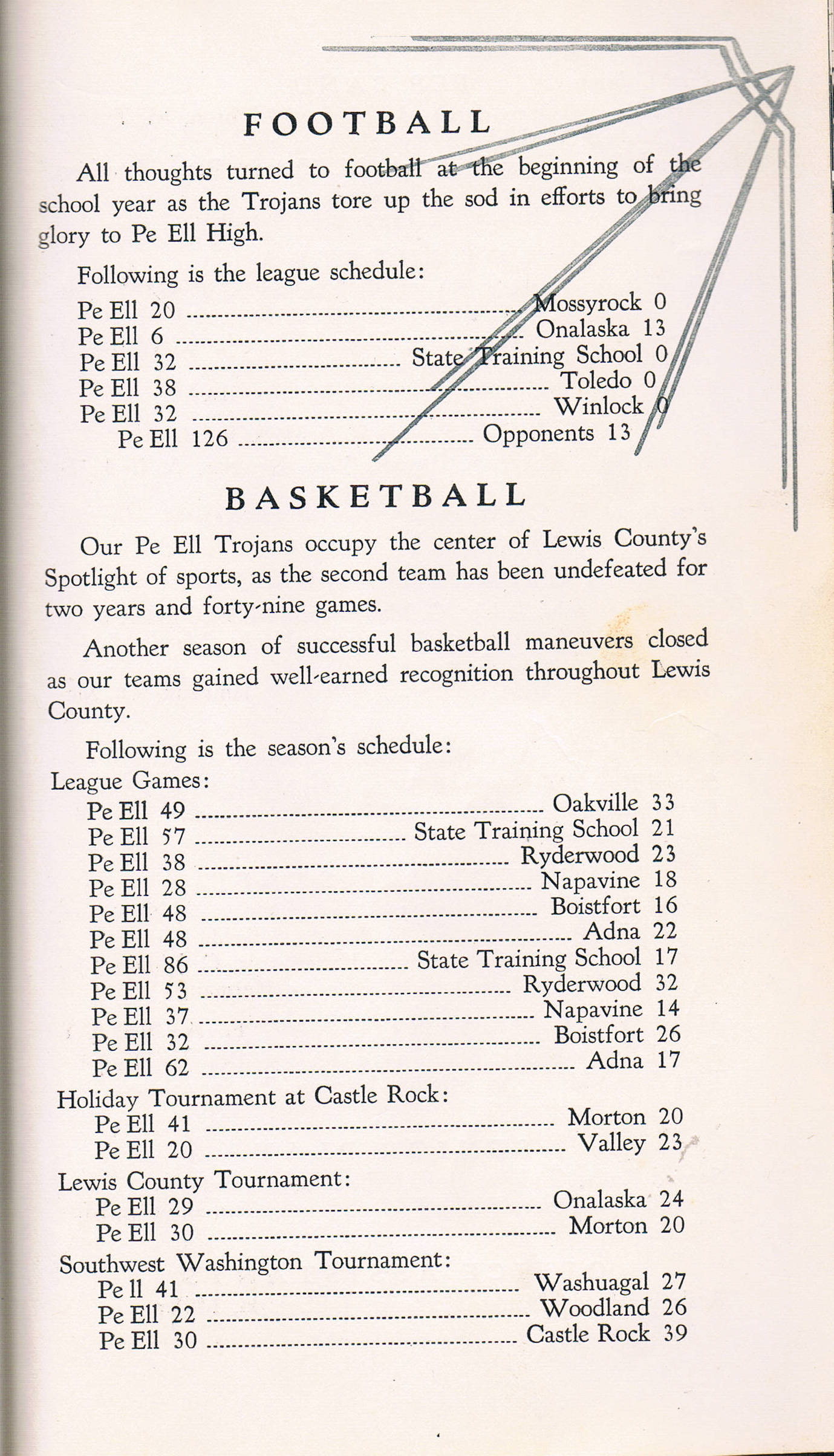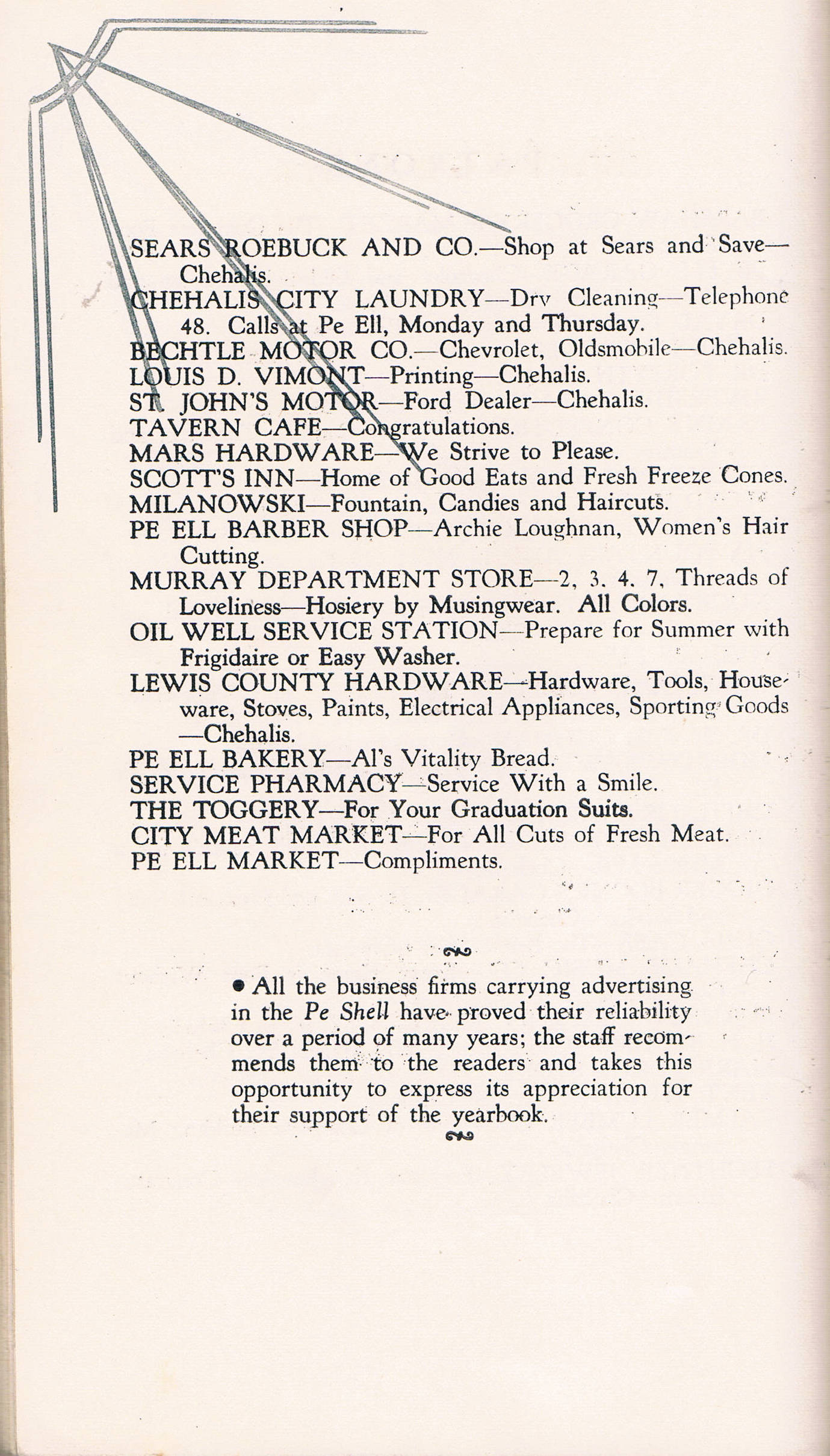Ches Packer contributed these scanned pages from the entire 1939 yearbook for Pe Ell High School. Each page is linked below. An Every-name Index is also available.