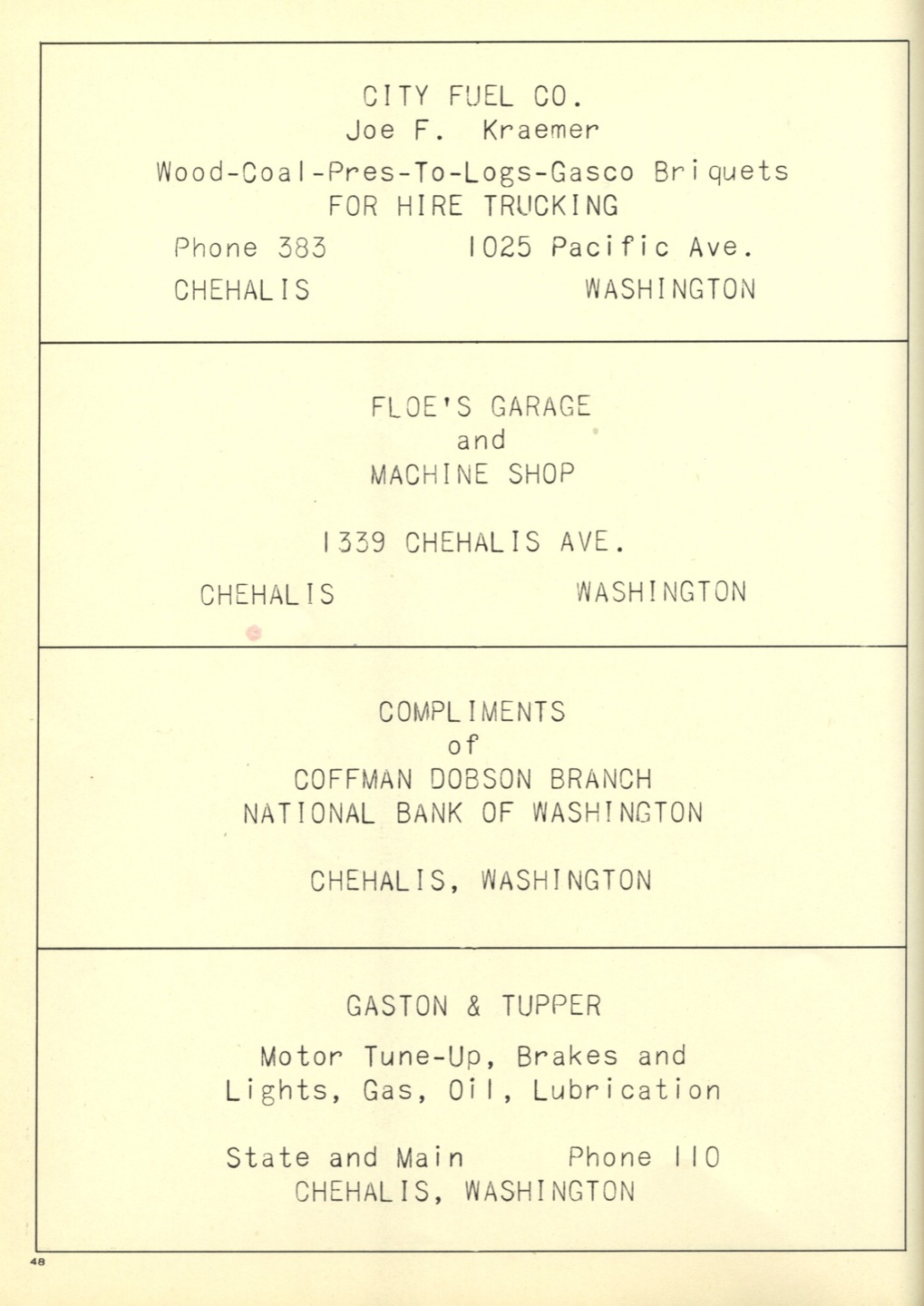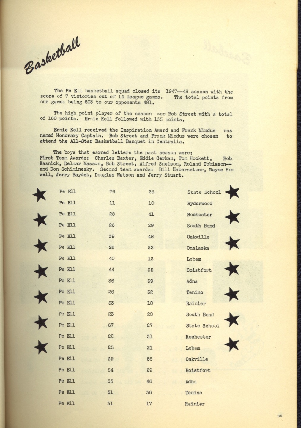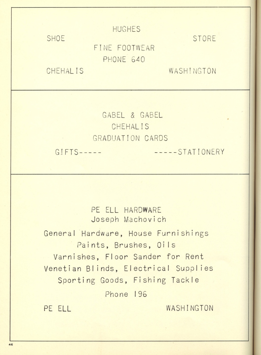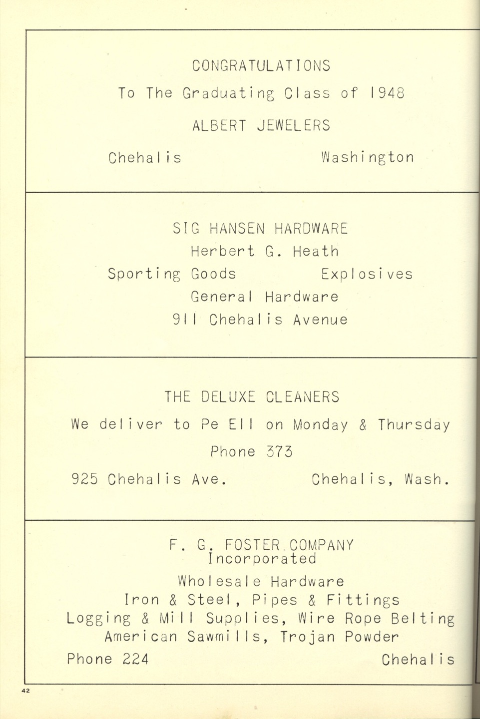 Ches Packer contributed these scanned pages from the entire 1948 yearbook for Pe Ell High School (Ches was a junior at Pe Ell in 1948). Each page is linked below. An Every-name Index is also available.