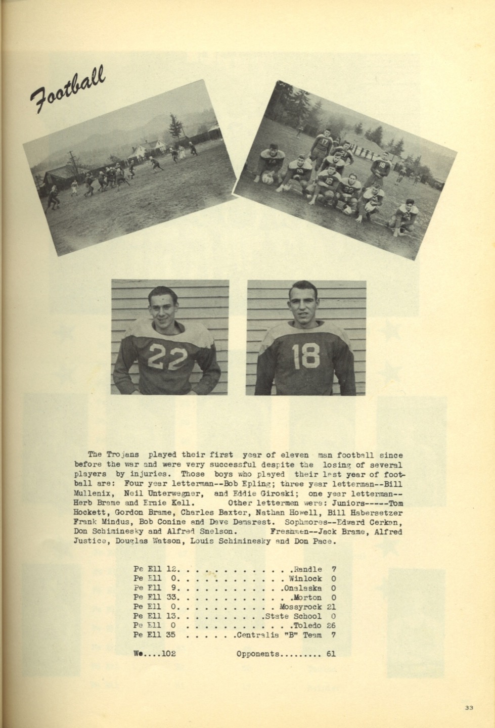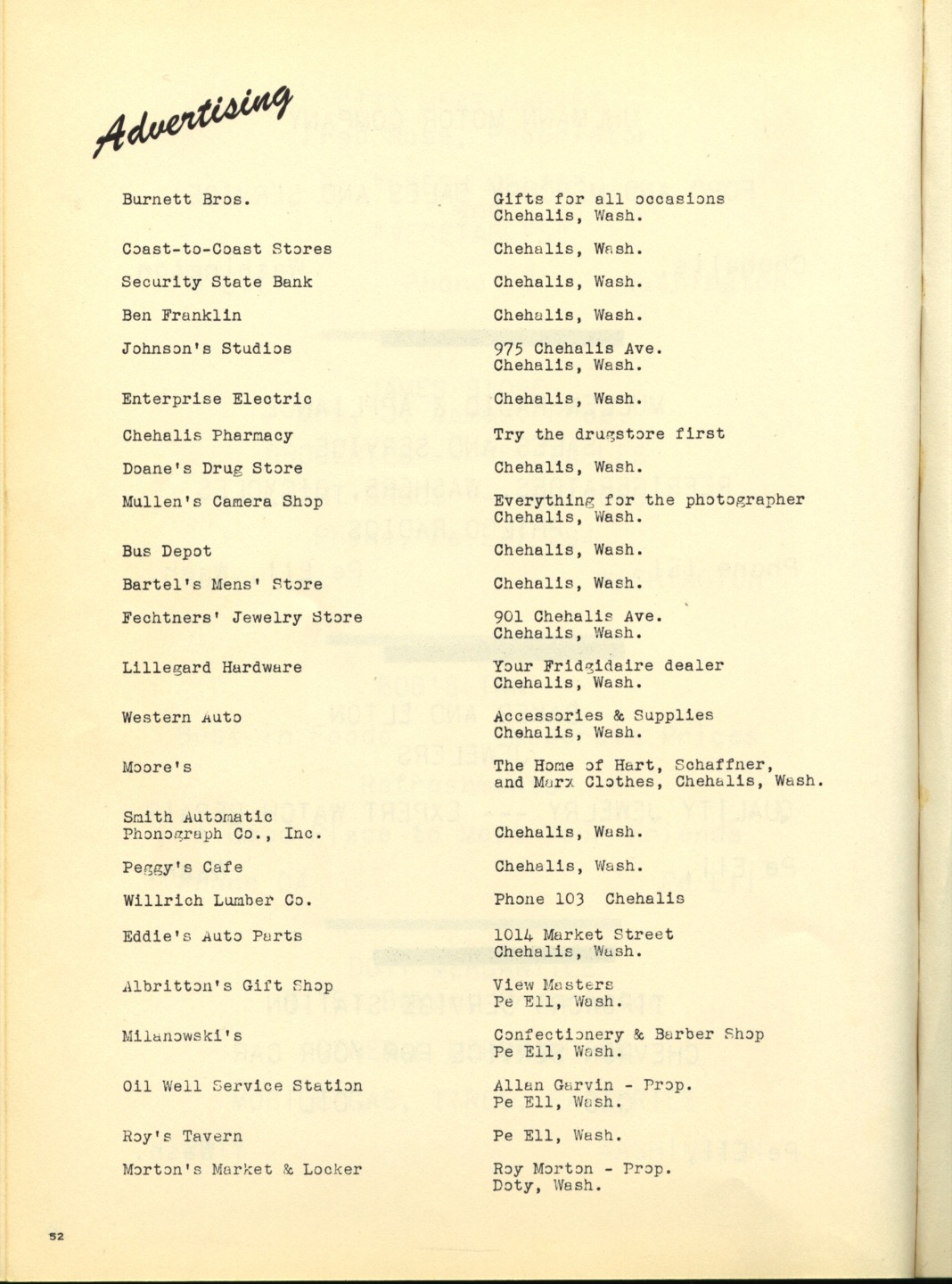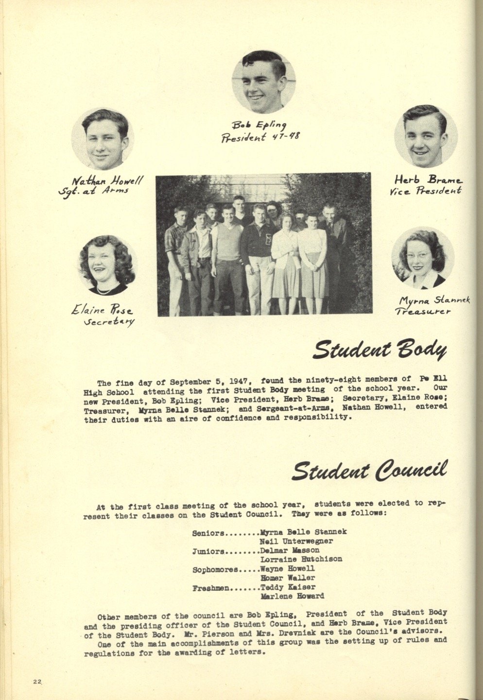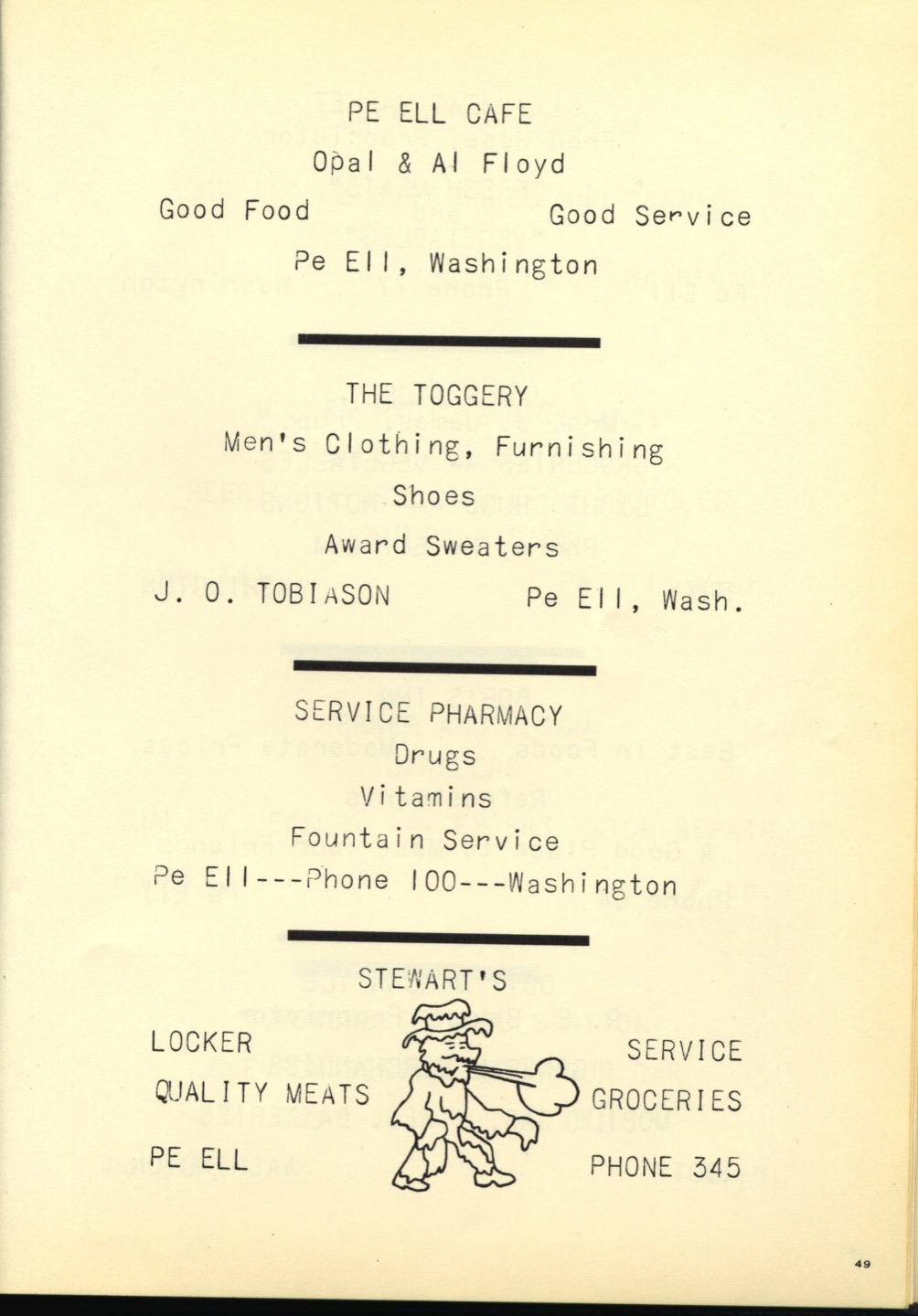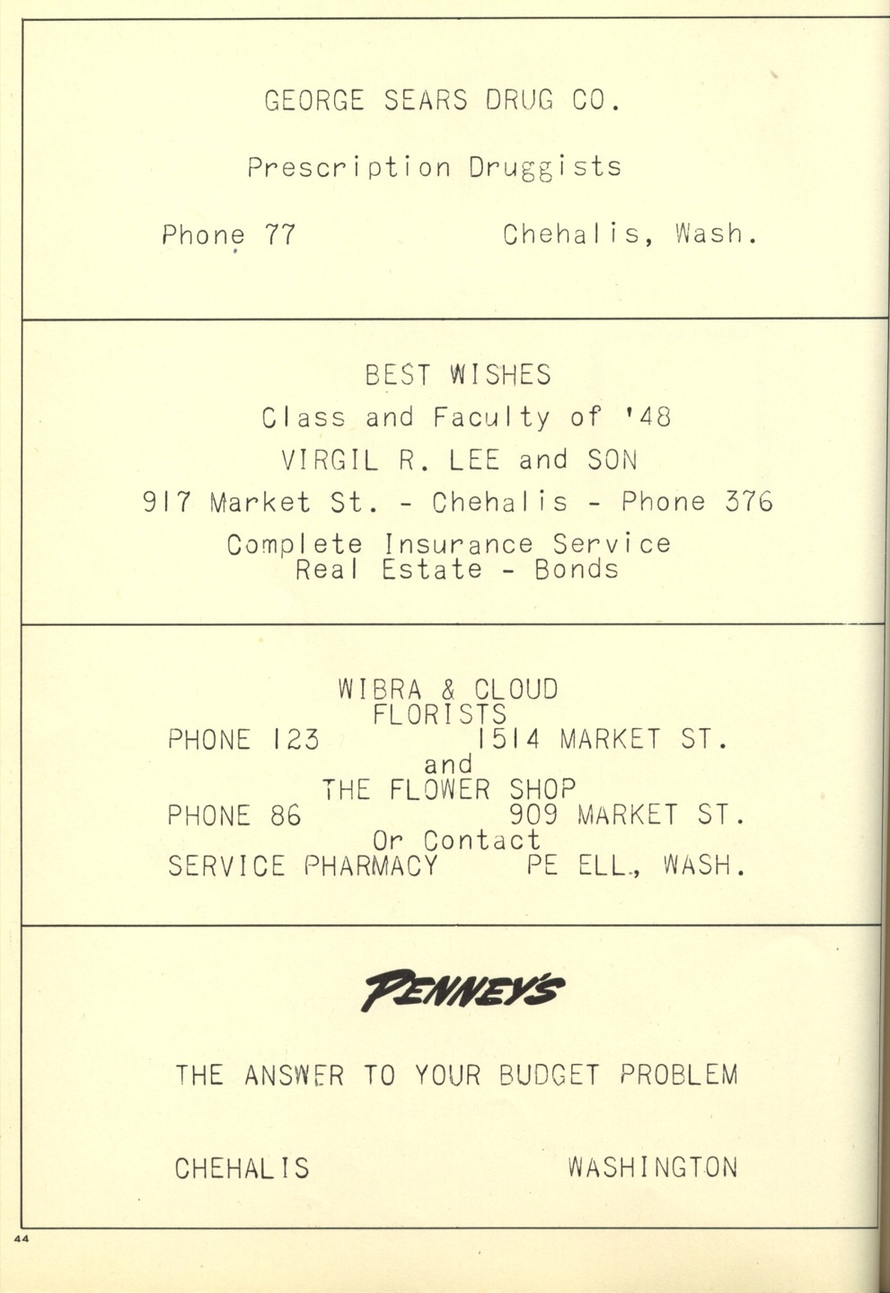 Ches Packer contributed these scanned pages from the entire 1948 yearbook for Pe Ell High School (Ches was a junior at Pe Ell in 1948). Each page is linked below. An Every-name Index is also available.