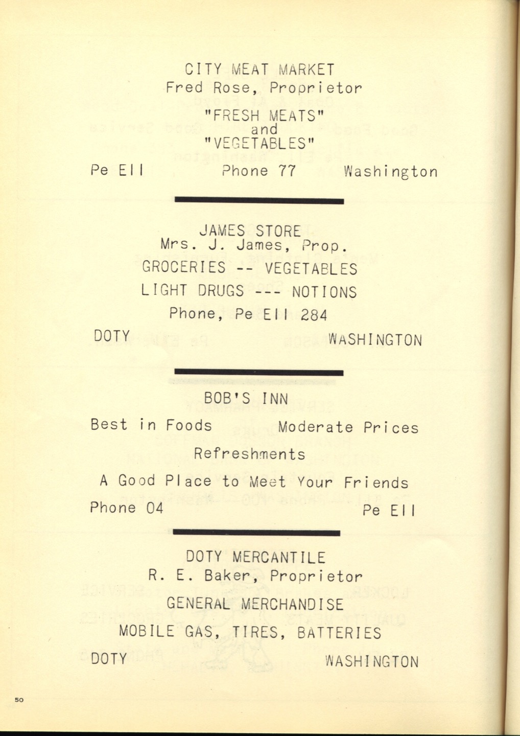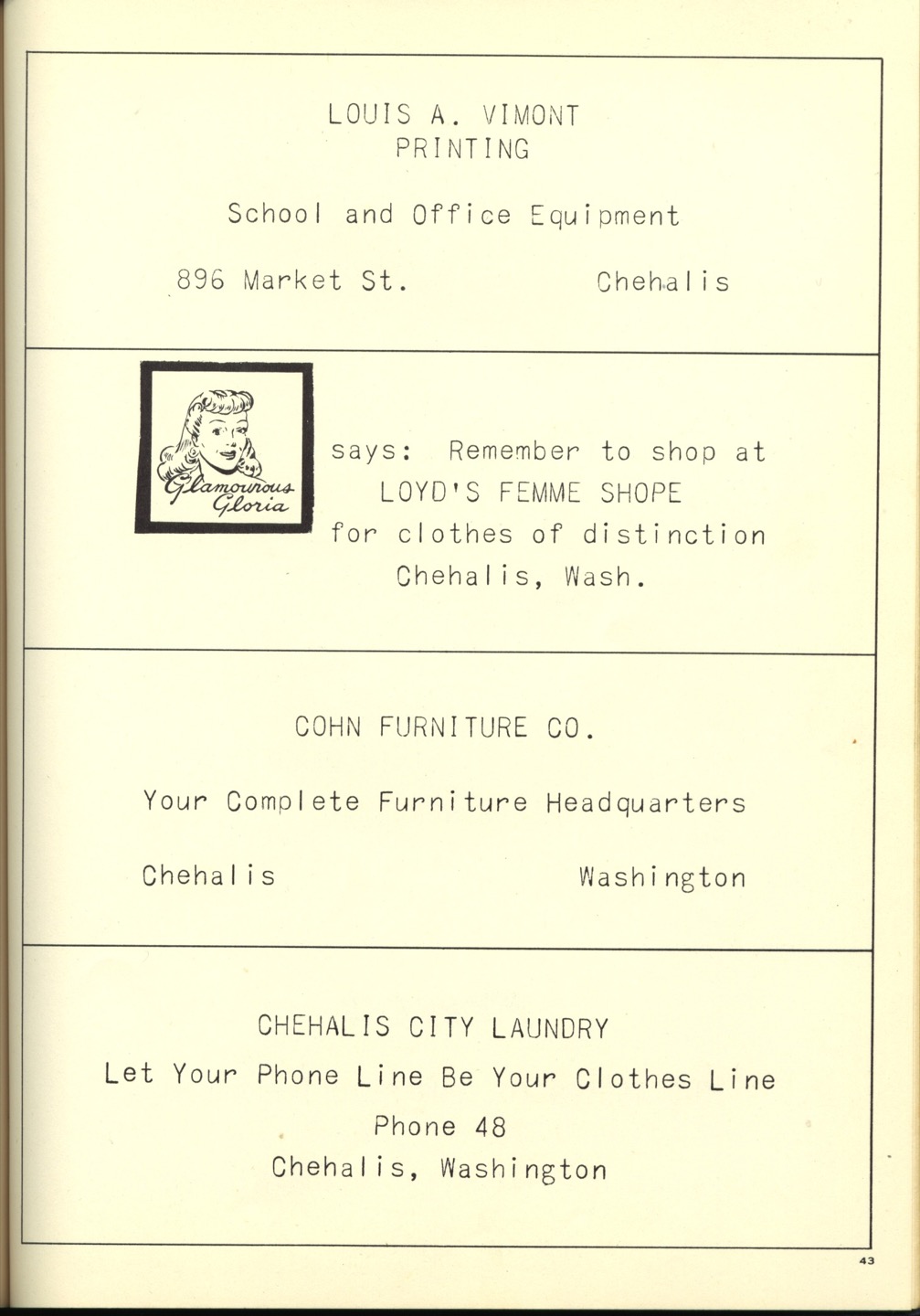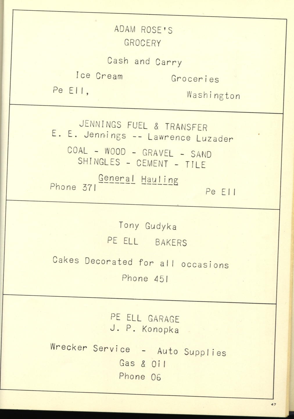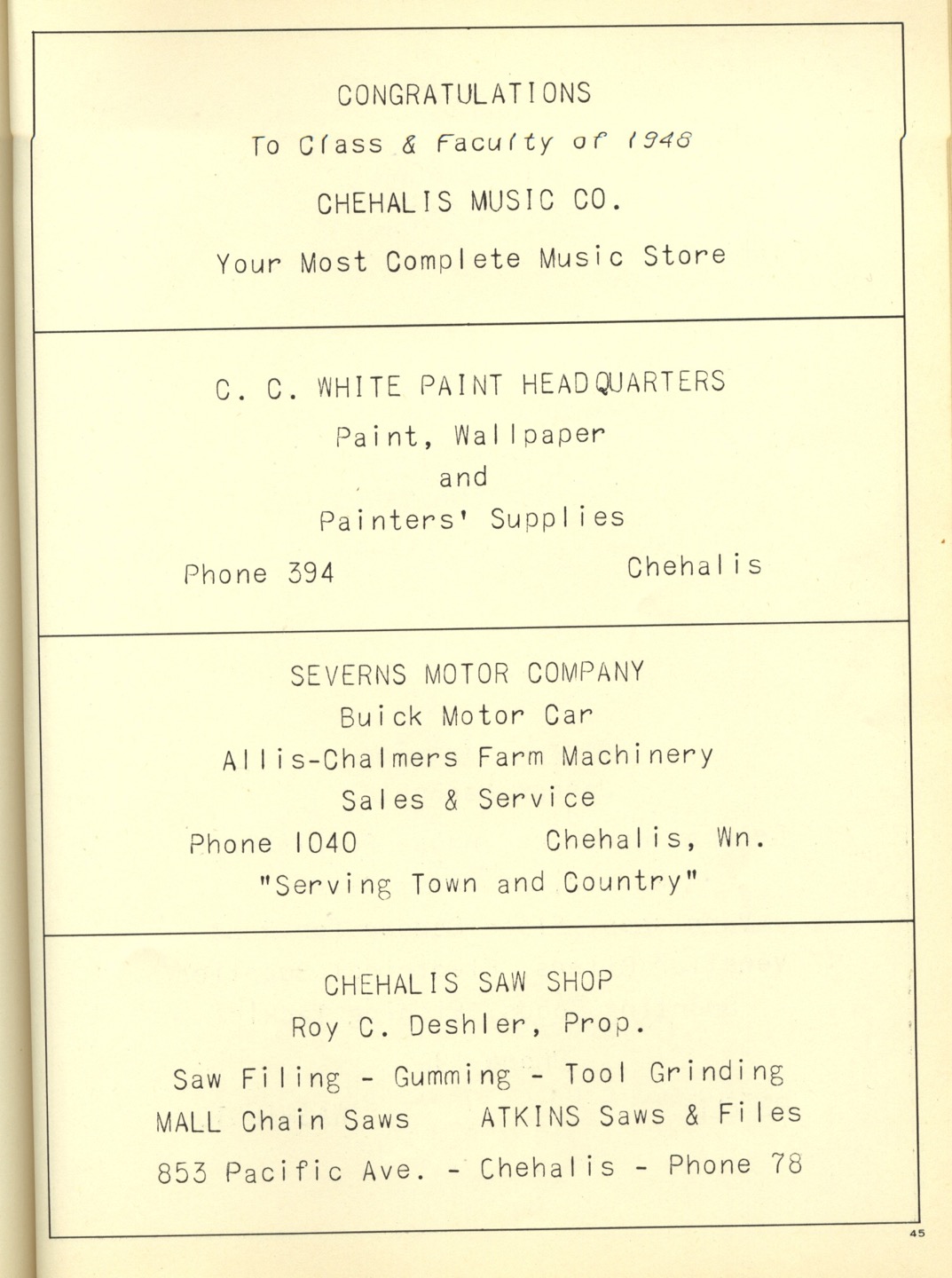 Ches Packer contributed these scanned pages from the entire 1948 yearbook for Pe Ell High School (Ches was a junior at Pe Ell in 1948). Each page is linked below. An Every-name Index is also available.