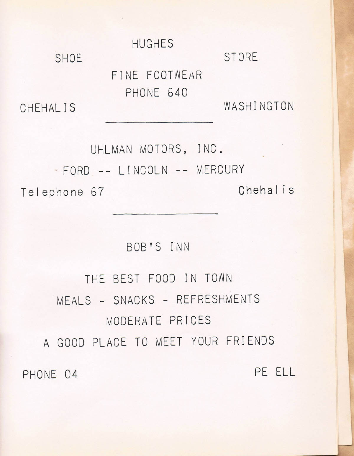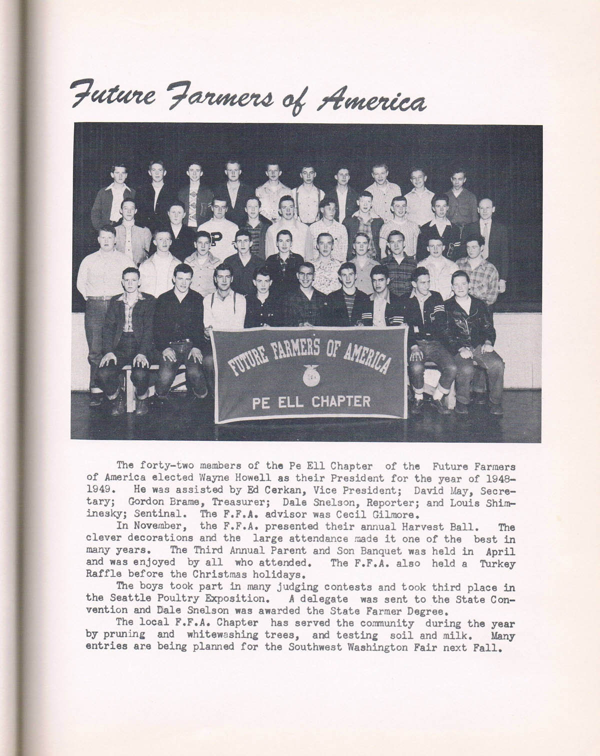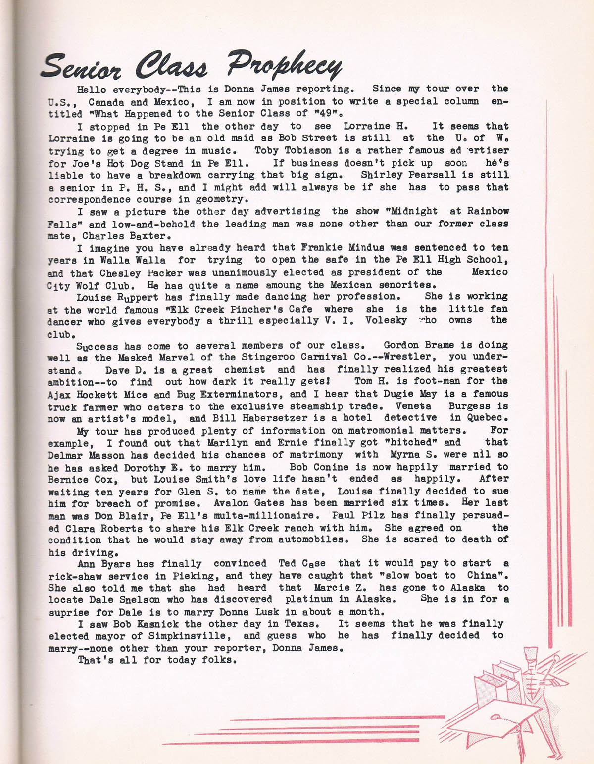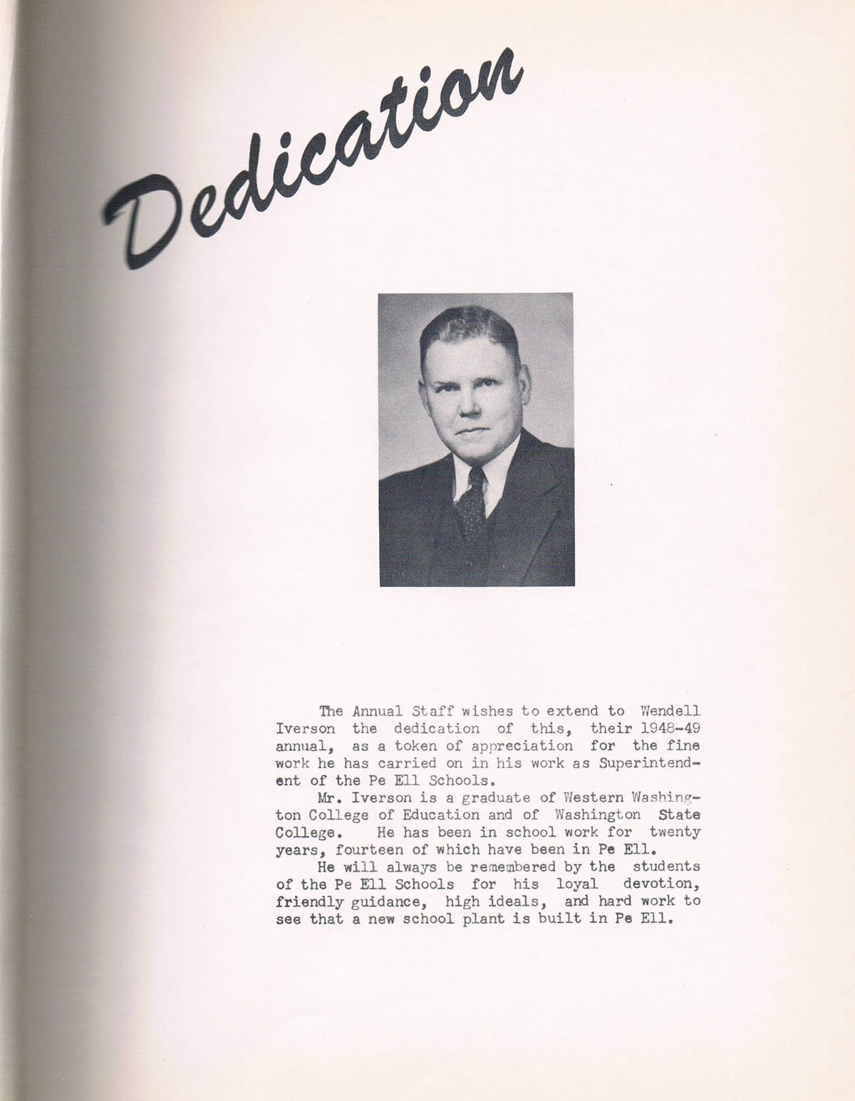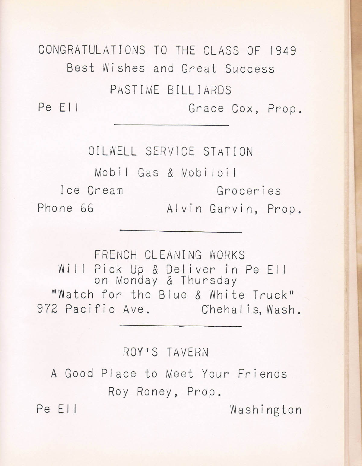 Ches Packer contributed these scanned pages from the entire 1949 yearbook for Pe Ell High School (Ches was a senior at Pe Ell in 1949). Each page is linked below. An Every-name Index is also available.