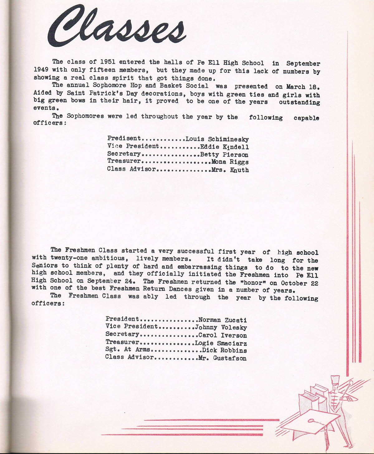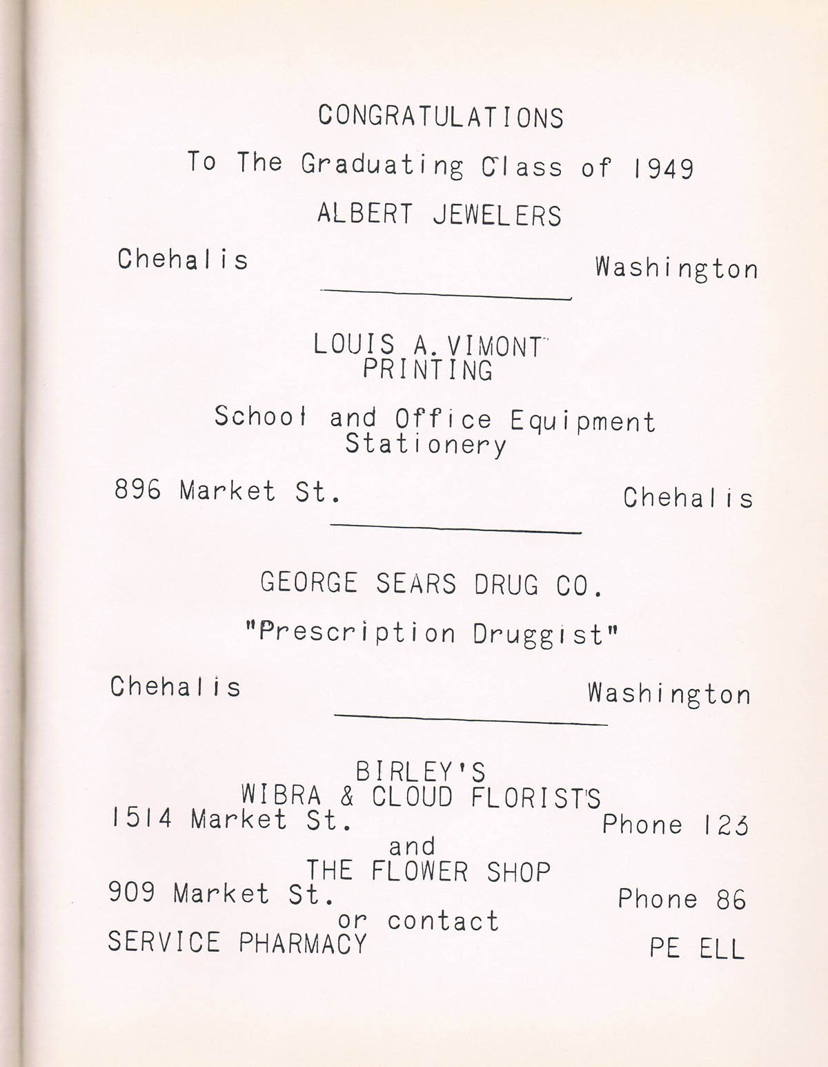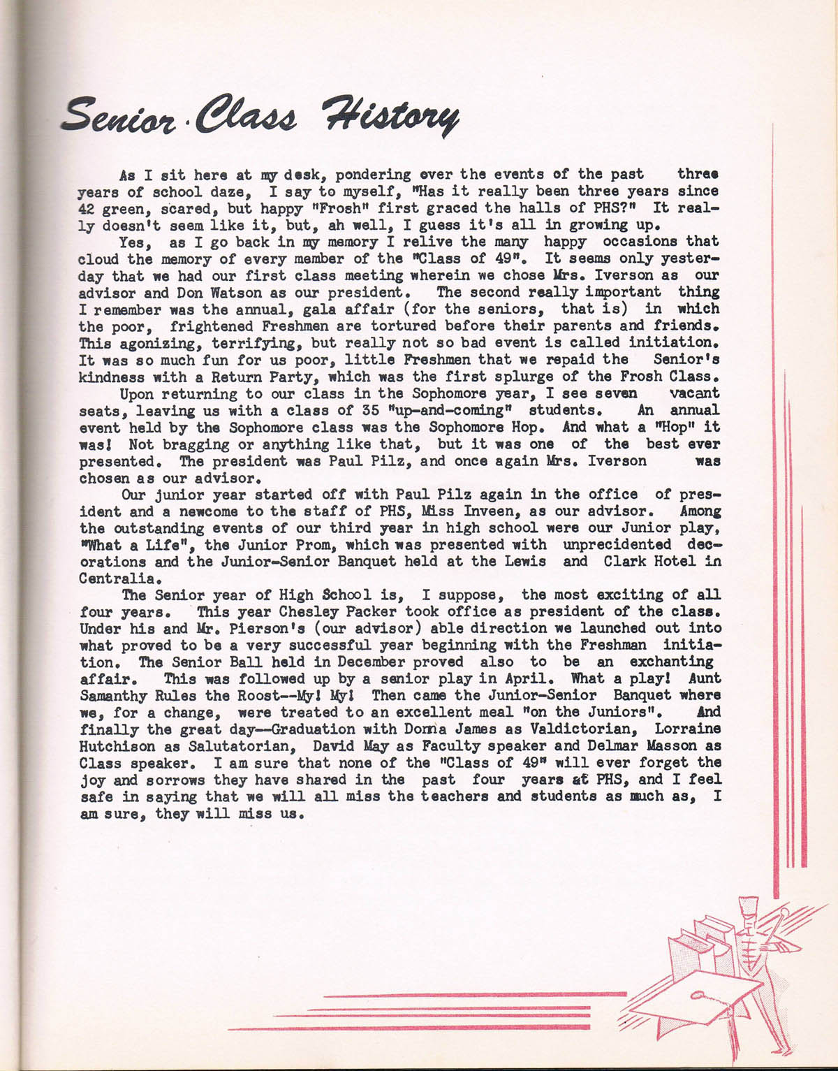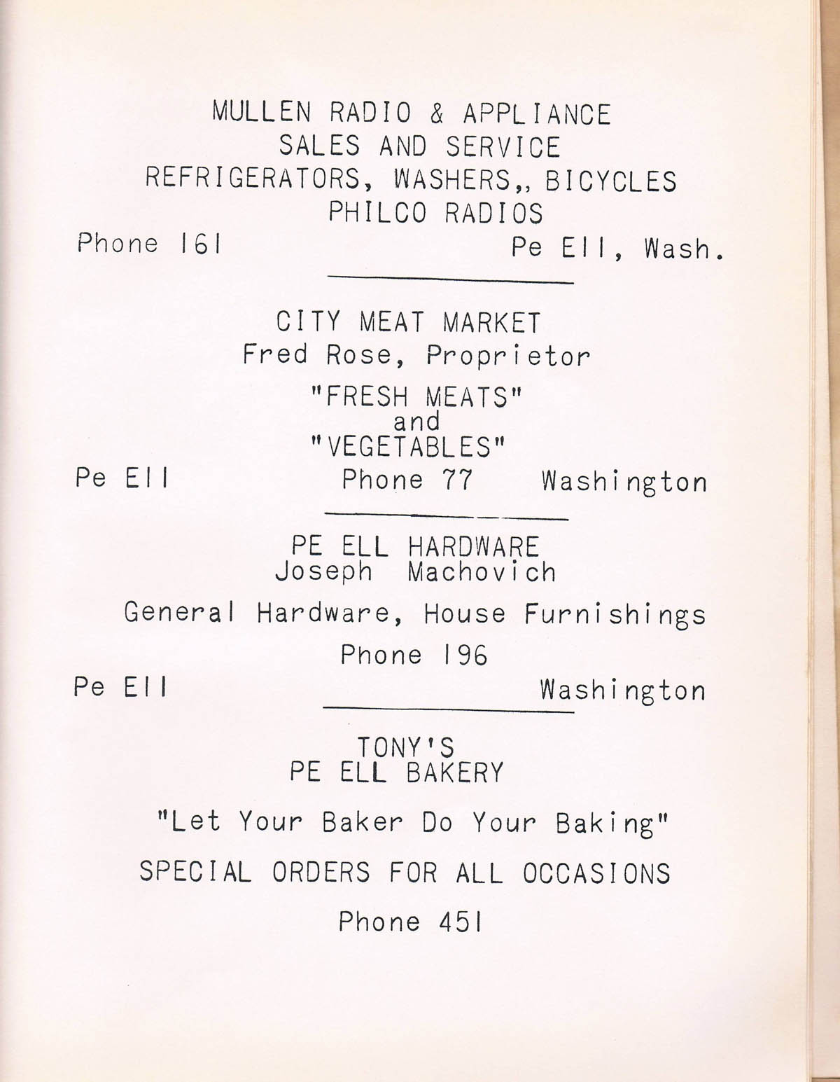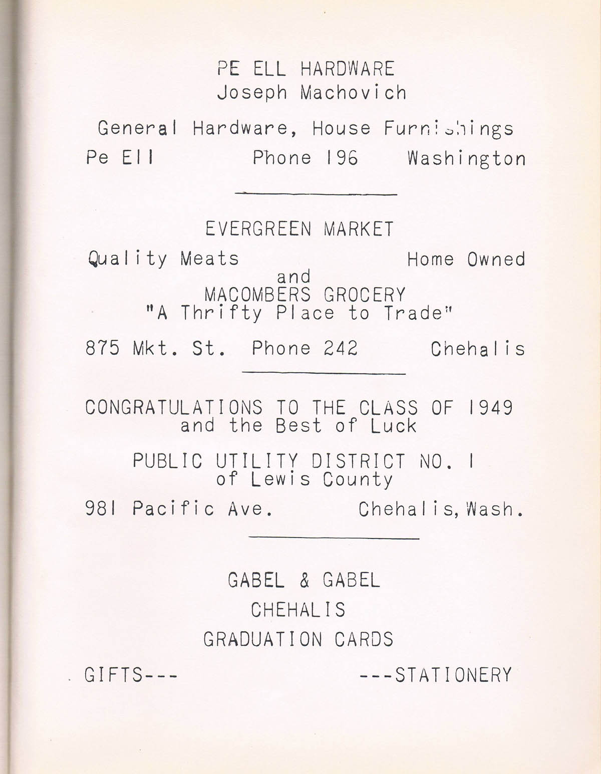 Ches Packer contributed these scanned pages from the entire 1949 yearbook for Pe Ell High School (Ches was a senior at Pe Ell in 1949). Each page is linked below. An Every-name Index is also available.