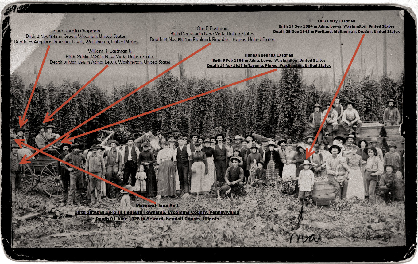 The photo below was contributed by Jason Eastman. The description of the photo reads: "Taken 1890 Dads' hopyard: William Eastman driving hack; Otis Eastman, brother of William, standing on ground towards back of hack; his wife (Aunt Maggie) in back seat; At her left Laura Rocella Eastman wife of William Eastman; Linda in front seat." Please contact Jason if you can identify others int he photo.
