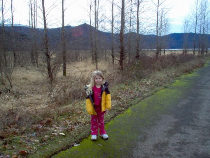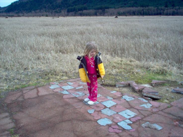 These pictures shows Tami's granddaughter standing on the site of the old town of Kosmos, which was drowned in the creation of Mayfield Lake and Dam: