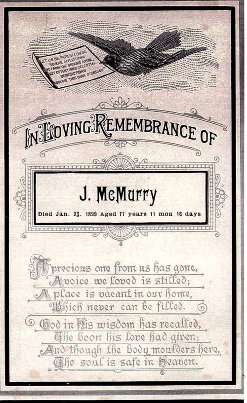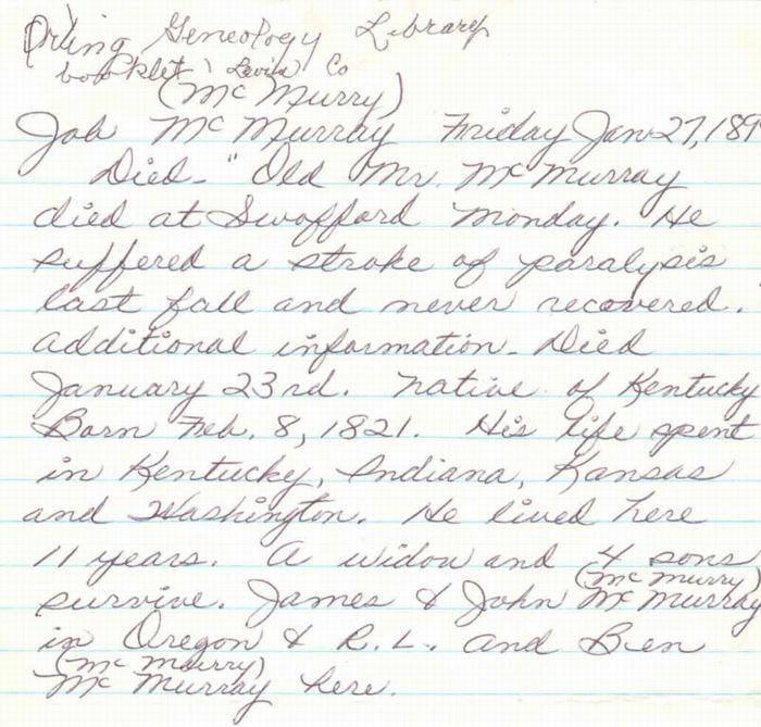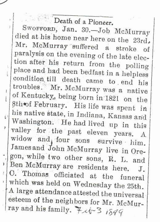 This obituary was taken and submitted by Tami (DeRossett) Moorcroft. Job McMurry was her great-great grandfather. He was born in Kentucky on 8 Feb 1821, and died at Swofford, Lewis Co., WA on 27 Jan 1899.