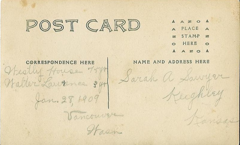 The child is Walter Lawrence, and the man is his Great-Grandfather, Wesley House. Taken in 1909 in Vancouver, Clark County, Washington. Sent to Sarah Pearcy Sawyer in Keighly, KS (see the back of the picture for more information).