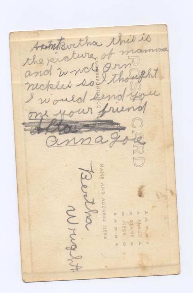 There is a note on the back side of the picture. I believe the note on the back side of the picture is from Alta Wright Gore's daughter Anna Gore. I had thought she was referring to my great aunt Bertha Gore Wright (Edwin John Gore's sister, my grand mother, Maude Gore Wright is another sister of Edwin's) but that doesn't make sense because the picture was found with Mary Wright Shockley's stuff (another daughter of George & Mary Wright.)"
