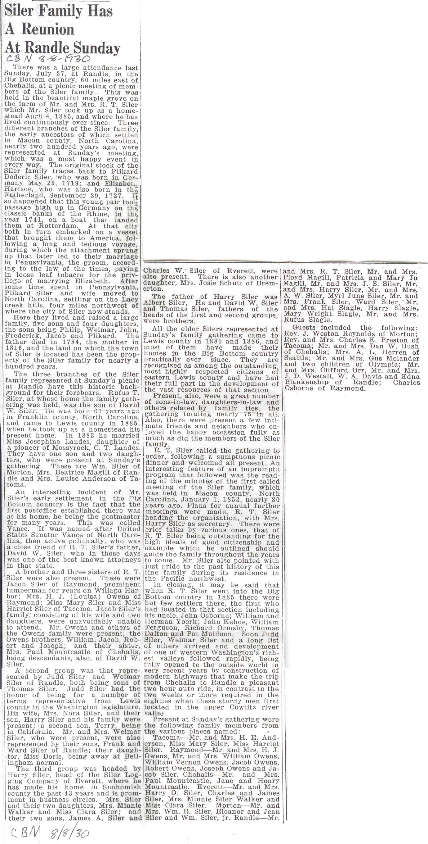 Source: ""Siler Family Has a Reunion at Randle Sunday." Chehalis Bee-Nugget, August 8, 1930.